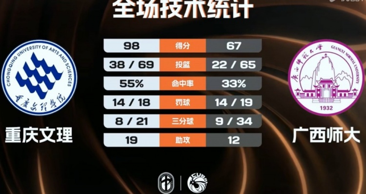 重庆文理:程千曜19分3板5助3断,杨伟斌19分11板,魏哲妍10分4板7助2帽,汤安福10分2板2助,胡梓恒8分6板,高小祥8分5板,聂飞9分2板,贾翔瑞8分4板